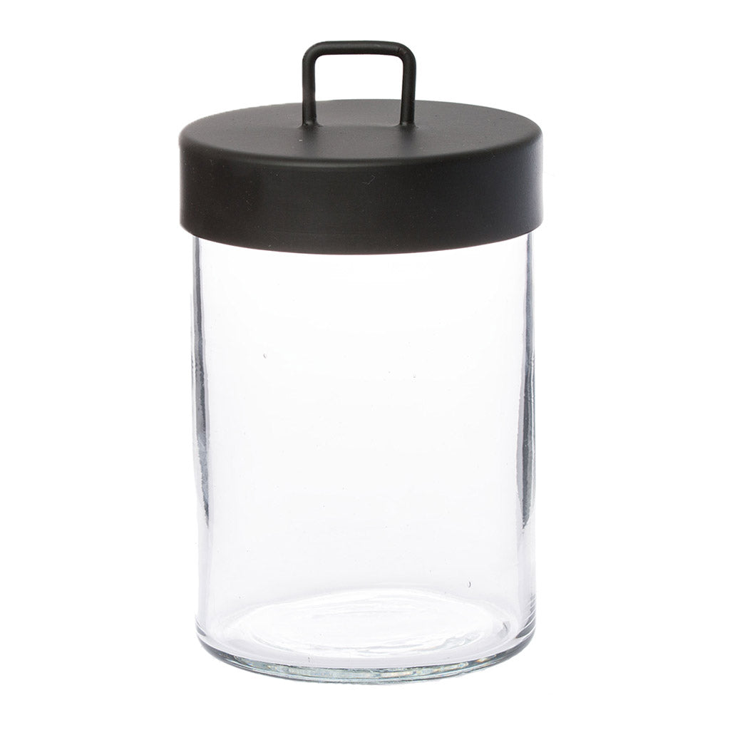 This handmade glass jar with powder coated black metal lid is perfect for bathroom or kitchen storage.