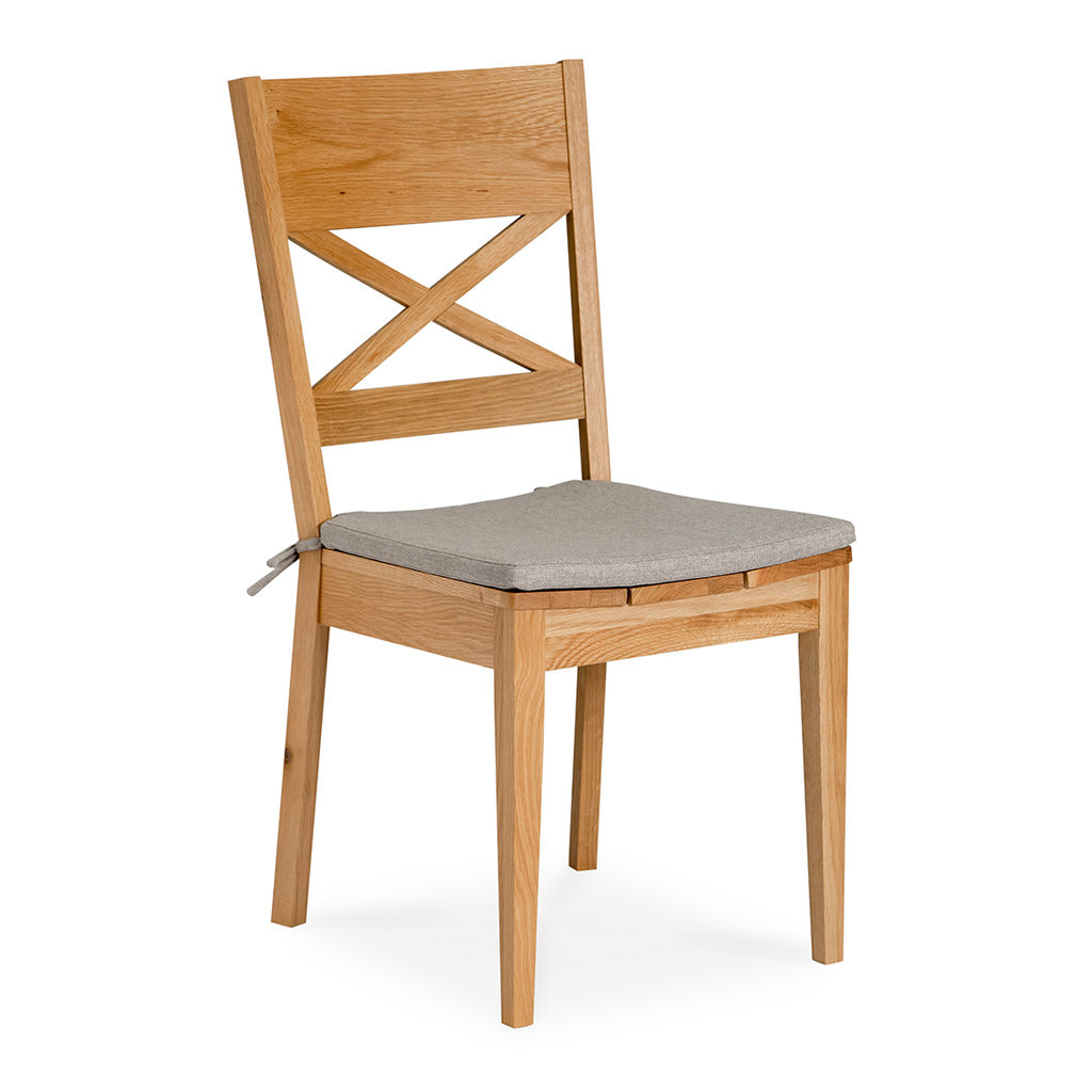 The Charlotte Dining Chair combines modern simplicity with classic charm. Clean lines keep the design sleek, while the French-inspired cross-back detailing exudes a rustic warmth. Perfect for both formal affairs and casual get-togethers, it features a removable tie-on seat cushion in a neutral grey palette, and elegant, tapered square legs. The beauty of natural rustic oak, combined with timeless design, makes this elegant chair a lovely addition to any home.