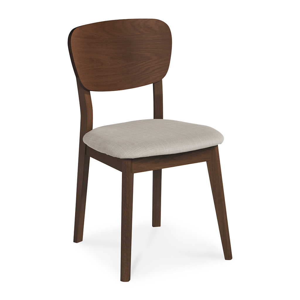 The Logan Dining Chair is simple and understated in design, featuring a curved back panel with clean, rounded edges, a fabric upholstered seat cushion in a neutral grey colour and elegant tapered legs. The warmth and beauty of richly stained American Walnut and European Beech wood, combined with the simplicity of contemporary Scandinavian design, makes this charming chair a lovely addition to any home.