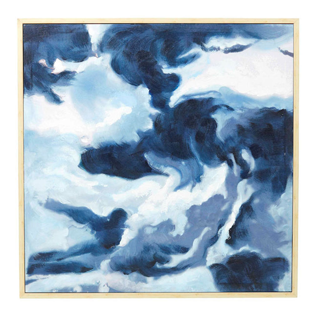 The canvas is hand-stretched and encased in an elegant frame, and the colour palette of various hues of blues suits most interior design styles, making it a beautiful feature in any home.